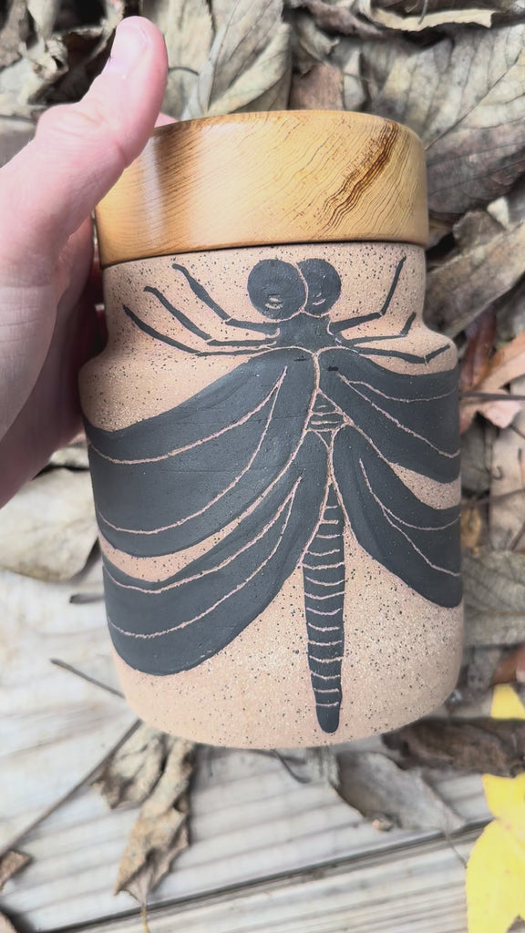 Hand Illustrated Sgraffito Stoneware Bullet Jar - Dragonfly